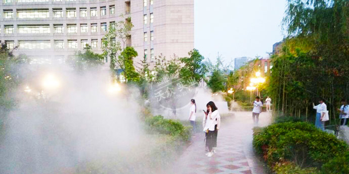 安裝于河南經貿職業學院的云霞菲霧系統是一種新型的造霧系統。通過多級的過濾裝置,首先把水源處理成超純凈水,這樣人呼吸到不會有雜質進入體內,然后經過超高壓,把水變成3~5微米的水分子,通過他們特質的噴頭噴出就可以達到這種煙霧繚繞的效果。
