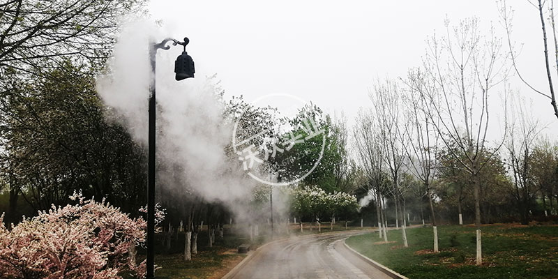 維護邯鄲的趙苑公園,依托于古風類型的燈桿安裝云霞菲霧系統(tǒng),可以造景,降塵,改善局部空氣環(huán)境。