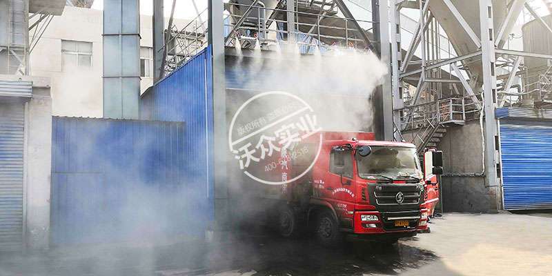 在卸料口處加裝空壓微霧降塵裝置,同時對車輛進