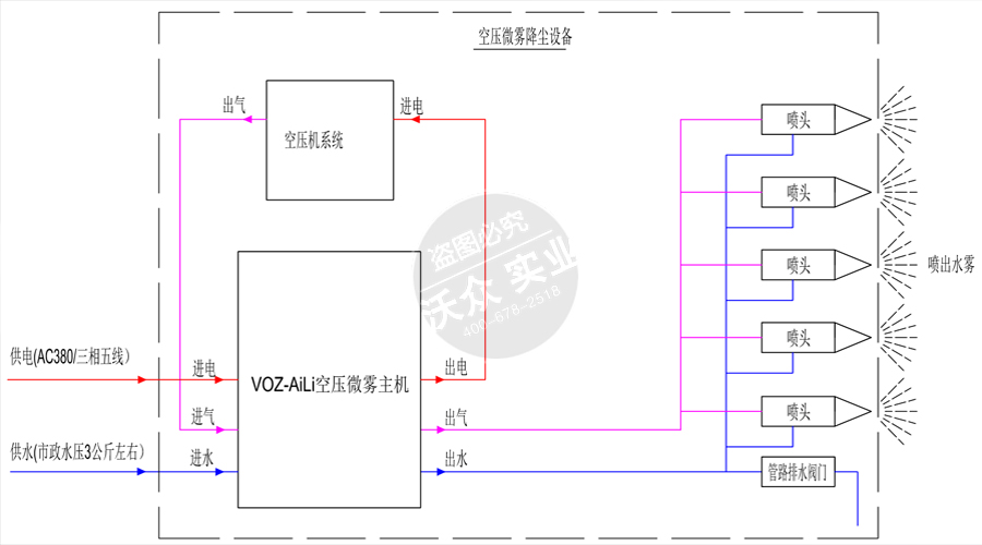 二流體噴霧設備是將分離的壓縮空氣和液體在特制的不銹鋼噴頭處匯合,把水利用高頻震蕩或高壓空氣瞬時吹散,產生干霧。根據粉塵聚合理論和空氣動力學理論,粉塵顆粒一般直徑在0.1um-80um,當粉塵顆粒與比它體積大得多的水滴相遇時,會被水滴旁邊的空氣流(流速更快)帶動前進而不與水滴相碰。而由二流體噴頭制造的的超細干霧顆粒大小為5-100um,與粉塵顆粒體積相近,不易受擾流影響,易于和粉塵結合,從而讓讓空氣中粉塵加快聚合使其沉降。同時電離的小水分子團帶電荷,張力更低,更易于與粉塵結合,讓粉塵與干霧之間相互吸附把小顆粒粉塵聚合成大顆粒,從而增加自重,自動沉降。