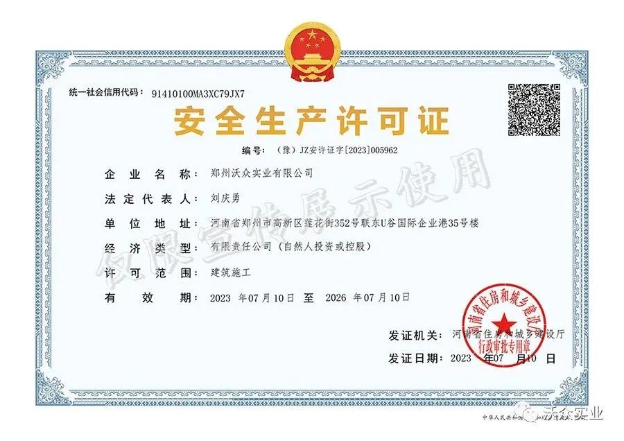 熱烈祝賀沃眾實業順利通過河南省城鄉和住房建設廳各項審核,再次成功取得《安全生產許可證》!